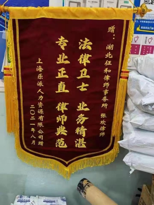 2021 年 8 月,上海某某人力资源有限公司负责人专程来到律所。这次过来是为了给张欢律师送一面锦旗。上面绣着“法律卫士 业务精湛,专业正直 律师典范”几行金字。