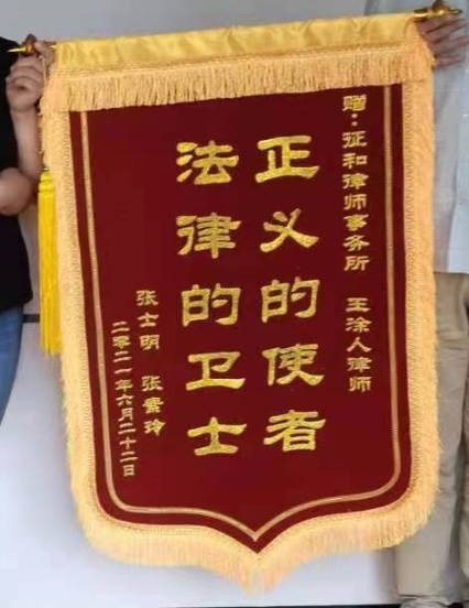 锦旗展开后,上面绣着“正义卫士 法律的使者”。郭某某说这是心里话,特意赶过来送一趟。王涂人律师接过锦旗,挂在办公室墙上。双方没多寒暄,委托事项已经处理完毕。