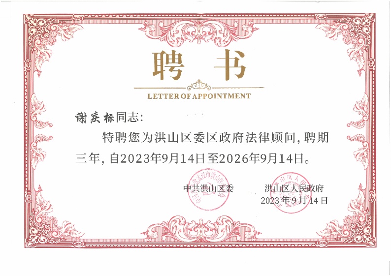 谢庆标律师受聘担任洪山区委区政府法律顾问